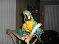 blauw en goud ara met kooi