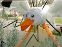 Deze ooievaar die door het raam vliegt is gemaakt van
