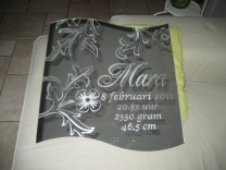 Een spiegel gegraveerd met de afbeelding van het geboortekaartje of door u zelf gekozen illustratie, eventueel aangevuld met naam, geboortedatum en geboortegegevens (tijd, gewicht, lengte en evt. geboorteplaats).
