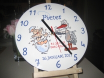Een klok van MDF beschilderd met de afbeelding van het geboortekaartje of door u zelf gekozen illustratie, eventueel aangevuld met naam, geboortedatum en geboortegegevens (tijd, gewicht, lengte en evt. geboorteplaats). De cijfers voor de tijdsaanduiding worden in hetzelfde lettertype geschilderd als de tekst van het kaartje.