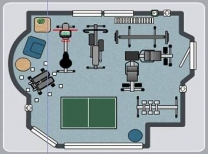 Ontwerp een fitness ruimte of sportruimte en ga inrichten met zonnebank, zwembad, jacuzzi, whirlpool, sauna met hometrainers sportbanden, roeimachines, spinning bikes, trilplaten, steppers, dumbels, crosstrainers, trampoline, tafeltennistafel, halterbanken en halters.